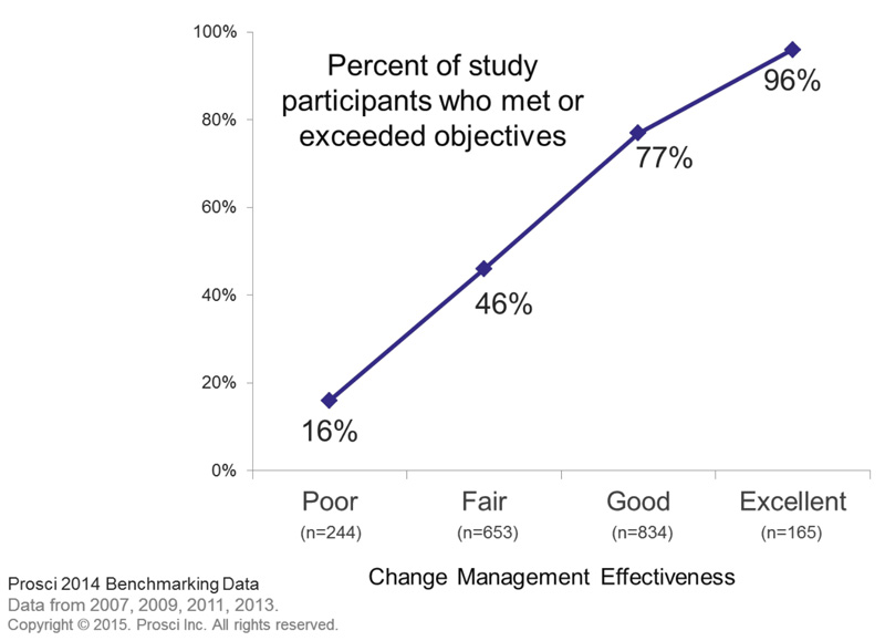 De acuerdo a Prosci Inc. en el estudio publicado en 2014 la tendencia indica que entre más eficaz sea el plan de Change Management se eleva la probabilidad a llegar o superar los objetivos del proyecto.